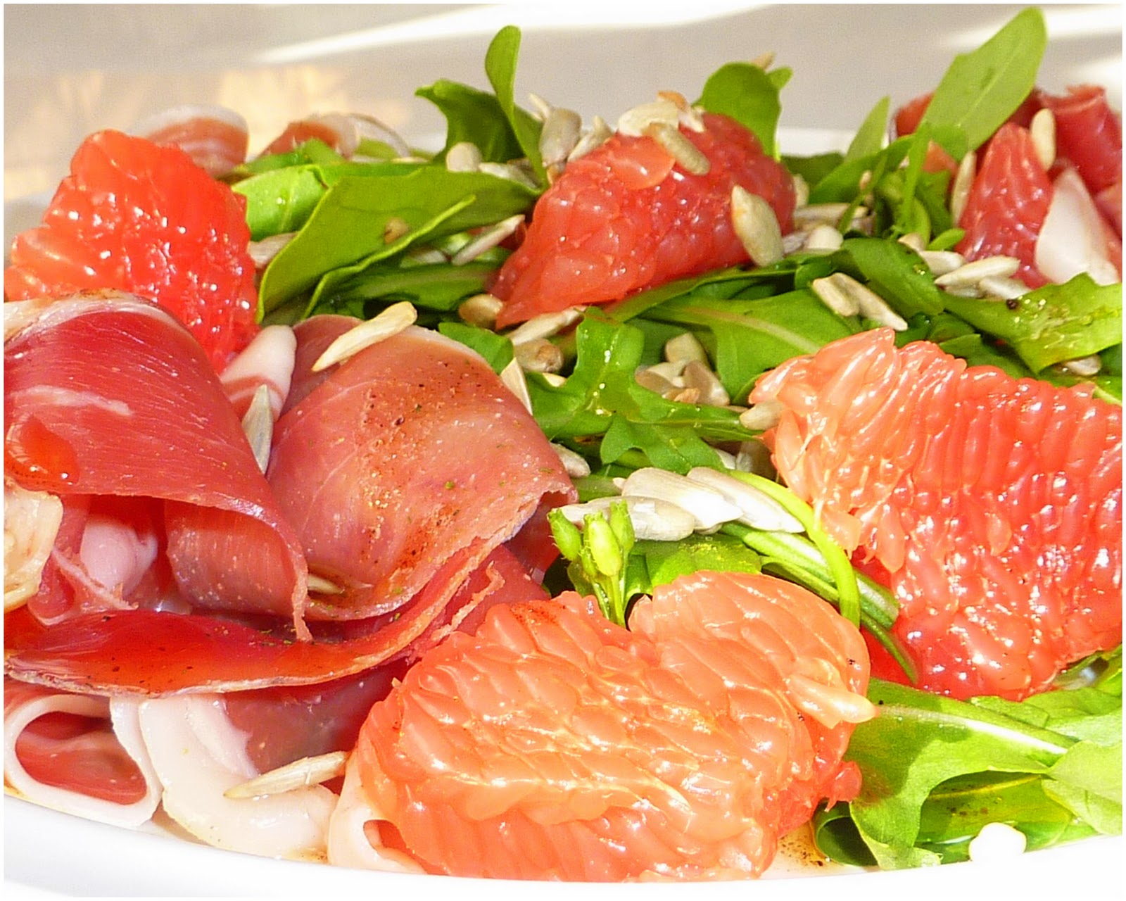 САЛАТ с грейпфрутом, рукколой и пармской ветчиной
